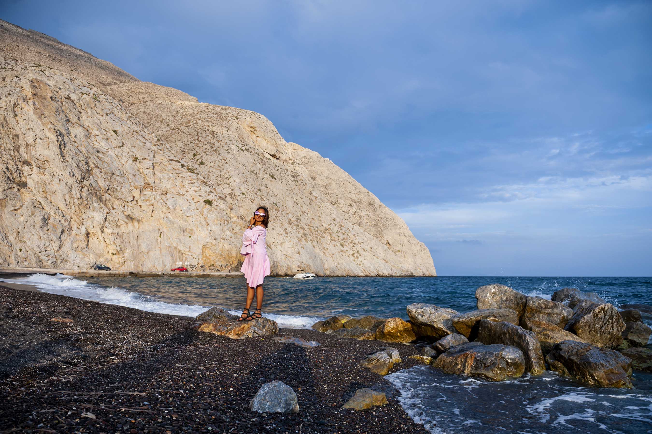 Your trip to Santorini isnโt complete without visiting the black sandy beach! We choose to go to Perissa Beach rather than Kamari. Its about 35 min away from Fira town. You need to take public bus from Fira Bus station to get to Perissa. The fare returns journey per person was โฌ4.80.